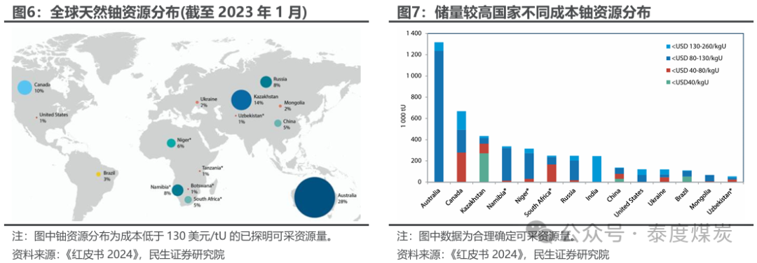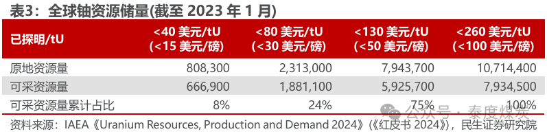 全球铀资源储量丰富,呈现地域分布不均、少数国家高度集中的特点。据IAEA,截至2023年1月1日,全球已探明可开采的铀资源储量为793.45万吨铀,其中开采成本低于80/80-130/130-260美元/tU的已探明可采资源量(包括合理确定可采资源量和推断资源量)占比分别为24%/51%/25%,低成本资源体量较小。全球铀资源地域分布不均衡,主要集中于澳大利亚、哈萨克斯坦、加拿大、纳米比亚、俄罗斯等国,成本130美元/tU以下的已探明可采资源量CR10高达89%。其中哈萨克斯坦低成本铀矿储量较丰,开采成本低于40美元/tU的合理确定可采资源量占比高达75%,从而也使其成为全球最大的铀矿开采国,2022年产量全球占比43%。
