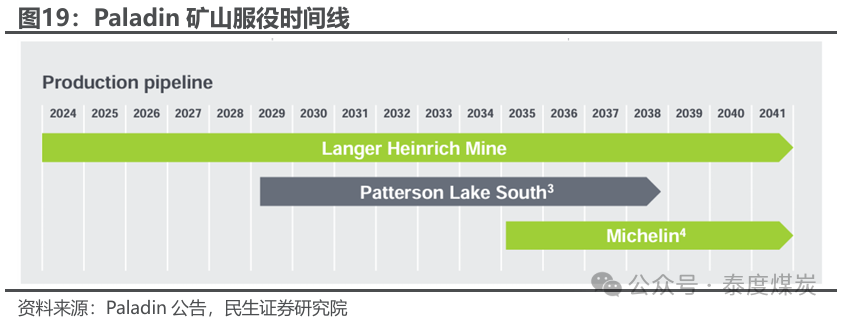Paladin铀矿资源量全球第三,待开发项目丰富。Paladin持有位于纳米比亚、加拿大和澳大利亚的多个铀矿项目股权,总资源量约为554.3百万磅U3O8,位居全球第三,仅次于哈原工(Kazatomprom)和卡梅科(Cameco)。其主要矿山项目包括:1)75%权益的纳米比亚在产矿山Langer Heinrich Mine(LHM)。LHM于2024年3月30日恢复商业生产,当前处于产能爬坡阶段,预计于2026财年达到600万磅/年的设计产能,以600万磅/年测算矿山寿命仍有17年,且公司当前正进行延寿计划。2)100%权益的Fission公司PLS项目。PLS为阿萨巴斯卡盆地最大的浅层、高品位铀矿床之一,资源量130百万磅,距地表最浅深度仅50m,具有高效、低风险特点,以910万磅/年测算矿山寿命10年,预计2029年开始生产。3)100%权益的Michelin项目。资源量127.7百万磅,设计产能约600万磅/年,2009年完成初步经济评估研究(PEA),预计2026财年完成可行性研究(PFS)。此外,Paladin拥有Mt Isa、West Cluff等位于澳大利亚和加拿大的多个高级及早期勘察项目,储备项目丰富。(注:澳大利亚财年为7月1日至次年6月30日,其他未表述为“财年”的年份均为自然年。)