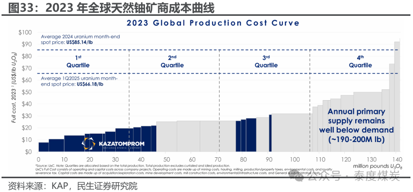 谢、奥公司成本管控较好增幅有限,持续受益低成本造就的充足盈利空间,MET税率上调有望支撑铀价。公司在哈铀矿均采用原位地浸(ISR)开采方式,相较露天开采、地下开采的传统方式,ISR成本优势显著,加之在哈萨克斯坦的迅速发展,使其成为近年来的主流开采方式,2024年全球产量份额达到54%,同时也使哈原工多数矿山成本处于全球矿商成本前1/4梯队,且远低于当前天然铀现货价格。展望2025年,硫酸价格上涨及MET资源税率上调或将进一步推高谢、奥公司生产成本,但考虑公司同业中成本较低,且人工成本管控良好、其他成本有所下降,预计整体增幅有限。此外,MET税率上调一方面抬升行业成本中枢,另一方面不考虑铀价上涨情况下或降低矿山提产意愿,加剧天然铀供给紧缺,有望对铀价形成支撑。