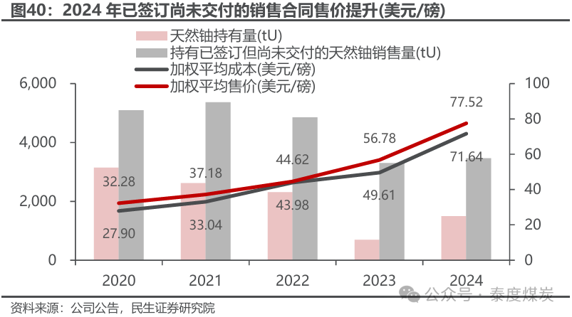 Ø 基准价格及年度递增系数上调,体现价格上涨预期。公司参考TradeTech《2025年铀市场研究:第一期》中2026-2028年长期参考价格每磅天然铀99.33美元,以及UxC《铀市场展望:2025年第一季度》中2026-2028年高长期价格预测每磅天然铀89.11美元的均值,将新三年基准价格厘定94.22美元/磅U3O8,年递增系数由3.5%上调至4.1%,由此计算2026-2028年公司基准价格分别为94.22、98.08、102.10美元/磅U3O8。