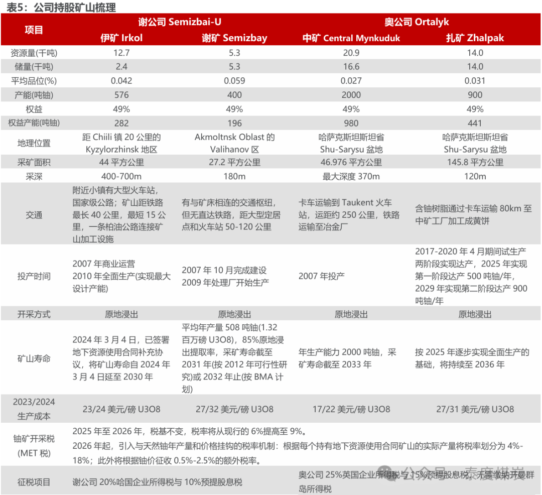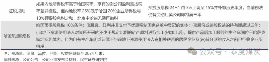 奥公司所得税率及预提股息税率较高,后续或有下调可能。因谢、奥公司分别通过中国内地北京中哈铀和英国中广核矿业英国公司持有,执行税率有所差异。当前谢公司执行20%哈国企业所得税与10%预提股息税,奥公司执行25%英国企业所得税与15%预提股息税。因哈萨克斯坦收紧税收协定优惠税率的适用口径,奥公司于2024年将预提股息税由5%上调至15%并对历史年度进行补缴,当前税法或仍有变动,且公司自2021年完成奥公司股权收购即将满三年,或满足哈国10%预提股息税条件中“股份或参股权益的持有期超过三年”一项,奥公司预提股息税率后续或有下调可能。