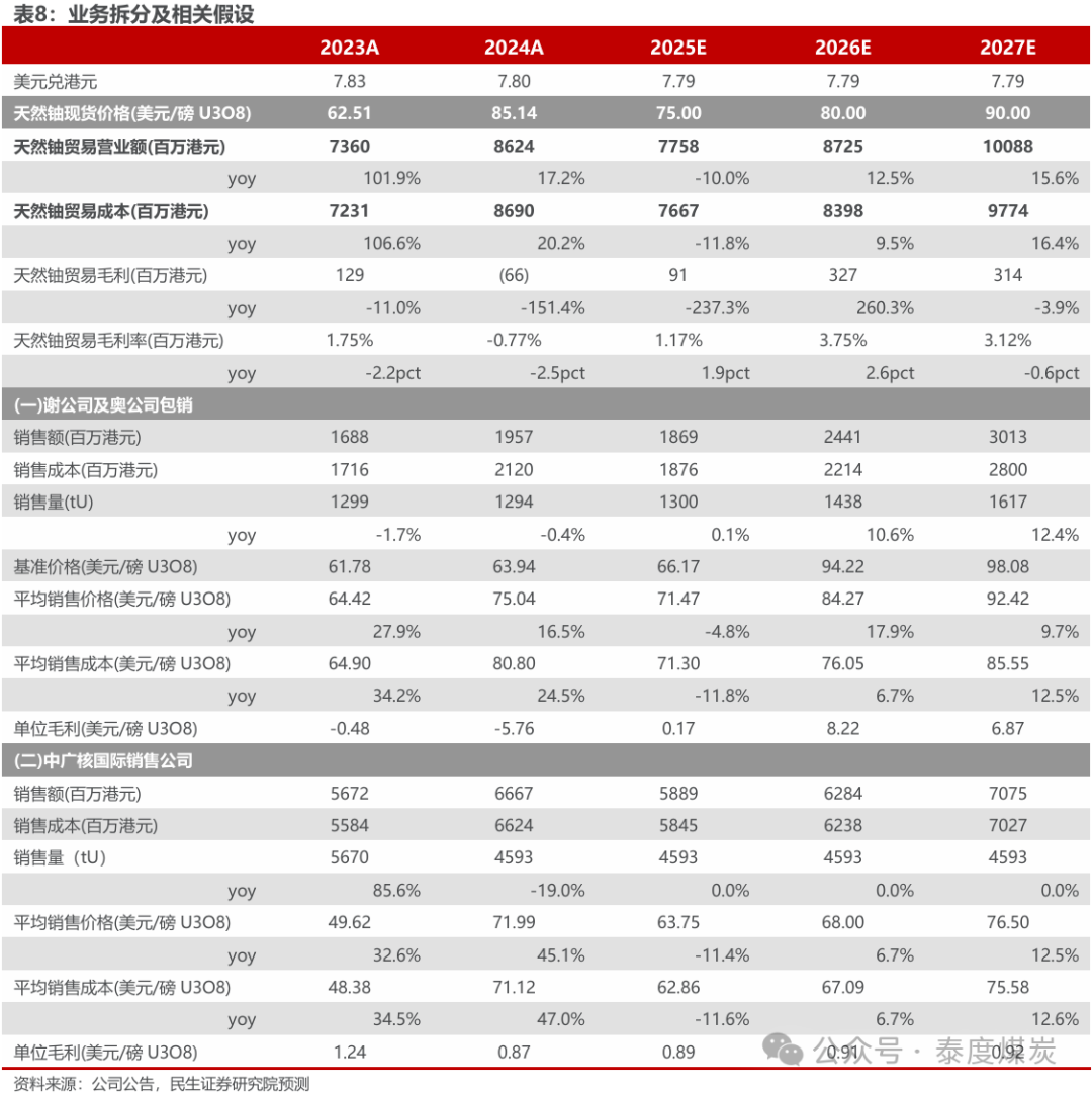 2)天然铀国际贸易:国际贸易平均售价参考2024年水平,采用与现货价格0.85倍率测算,2025-2027年分别为63.75/68.00/76.50美元/磅U3O8,假设伴随高成本货源逐步消化完毕、价差稳步改善,分别达到0.89/0.91/0.92美元/磅U3O8,则对应平均销售成本分别为67.09/75.58/79.81美元/磅U3O8。