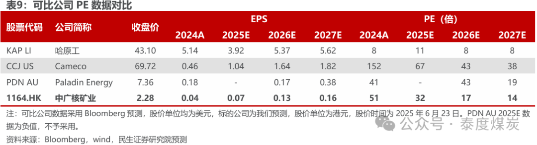 考虑主要业务相似性,我们选取海外铀业公司哈原工、卡梅科和帕拉丁能源作为可比公司,2024-2027年平均一致预期PE为66/38/31/22倍,均高于中广核矿业。公司是东亚铀业贸易龙头,受益铀价上行及销售定价机制调整,业绩估值有望共振,我们预计2025-2027年归母净利润为5.39/9.94/12.09亿港元,对应EPS分别为0.07/0.13/0.16港元/股,对应2025年6月23日PE为32/17/14倍。首次覆盖,给予“推荐”评级。
