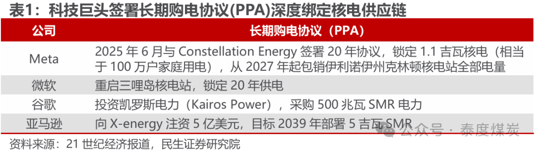 人工智能高算力催生稳定电力需求。伴随AI技术快速发展,微软、亚马逊、OpenAI等巨头先后布局,数据中心和云计算中心的算力需求急剧增加,国际能源署(IEA)预测,2030年全球数据中心电力需求将达945TWh,略高于日本当前总用电量,其中AI应用是主要增长引擎。数据中心需7×24小时不间断供电,而风电、光伏受天气制约,传统电网难以满足其高耗能需求,核电作为能够提供稳定基荷电力的低碳能源,除上述利用小时数远高于其他电源外,其全生命周期度电碳排放仅5.7克,不足光伏的1/10,因而开始受到科技巨头的青睐,其与核电公司签署长期购电协议(PPA),深度绑定核电供应链,从而催生未来稳定电力需求。
