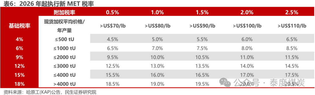2025年MET税率由6%上调至9%,2026年谢、奥公司税率有望下降。根据哈原工2024年7月10日发布的公告,哈萨克斯坦政府7月1日发布税法修正案,铀矿开采税(MET税)税率2025年从2023年1月1日开始执行的6%上调至9%;2026年及以后,MET税率分为“根据地下资源使用协议(Subsoil Use Agreement)下的铀矿年产量确定的基础税率”和“根据现货加权平均价格确定的附加税率”,基础税率介于4%-18%,附加税率介于0.5%-2.5%,最终MET税率为基础税率与附加税率之和,税额为公开现货加权平均价格×年产量×MET税率。就谢、奥公司矿山而言,2025年MET税率均上调3pct至9%,2026年不考虑附加税率,谢、伊、中、扎矿年产量所对应的基础税率分别为4%/4%/9%/4%,较2025年显著降低。(注:伊矿2023年产量569tU,但考虑2025年后产量或有下降,我们预计2026年产量在500tU以下,对应基础税率4%。)