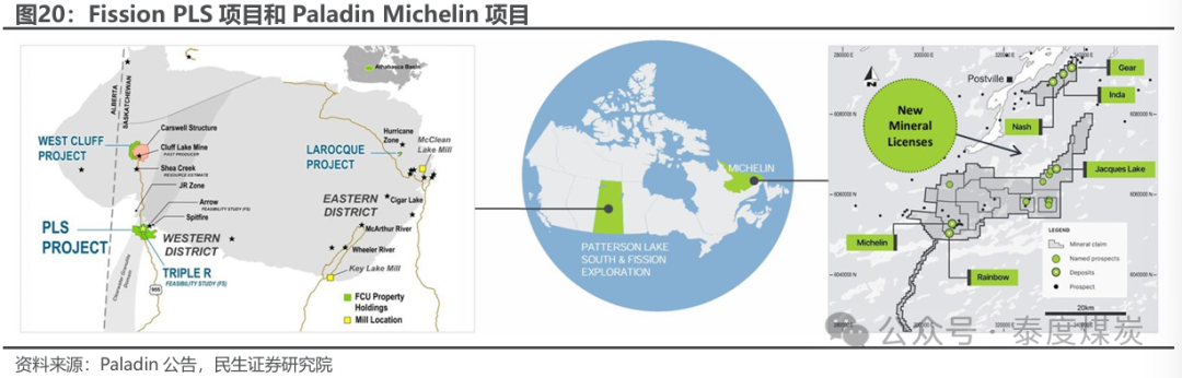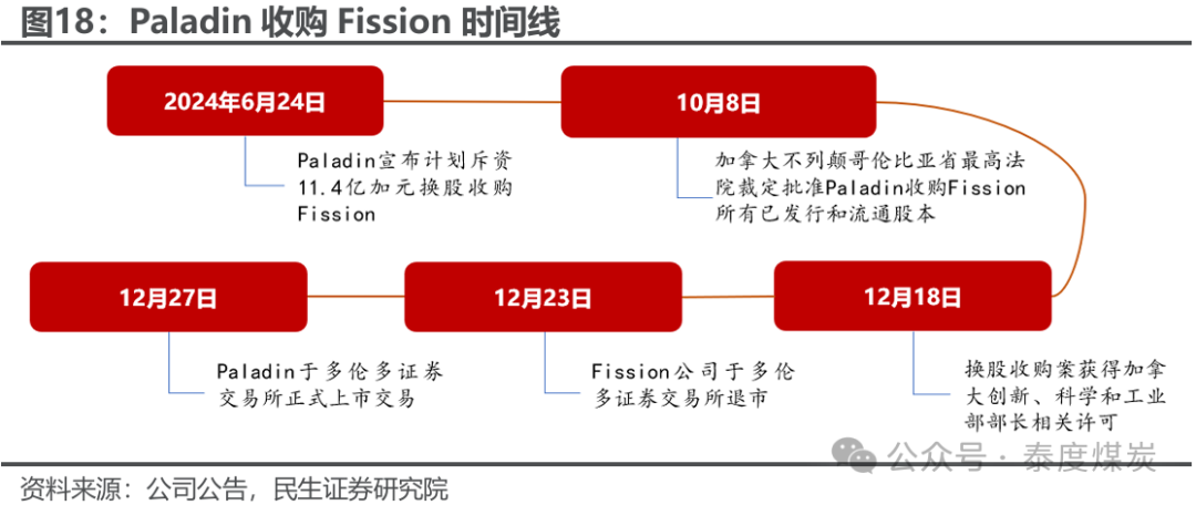 Paladin 换股收购Fission,公司现持股Paladin 2.61%股权。公司原持有加拿大上市公司Fission Uranium 11.26%的股权并拥有待开发的帕特森湖南(PLS)项目,2024年6月24日,澳交所上市铀矿开采和开发公司帕拉丁能源(Paladin Energy,PDN.AX)宣布计划斥资11.4亿加元换股收购Fission,其看好Fission矿床靠近主要铀消费国美国,并能够和Paladin在加拿大现有的矿权地合并打造一处铀矿枢纽。经加拿大法院裁定批准,每1股Fission公司股份可获得0.1076股Paladin公司股份,每股隐含价值为1.30加元(按2024年6月21日的前20天成交量加权平均价计算溢价30%),交易完成后,Fission公司股东将持有Paladin公司24.0%的股权。2024年12月Fission和Paladin先后于多伦多证券交易所完成退市和上市,Paladin预期两地上市后总市值有望达到35亿美元。截至2024年12月31日,公司原持有Fission11.26%股权已全部转换为Paladin公司股票,持股比例2.61%。
