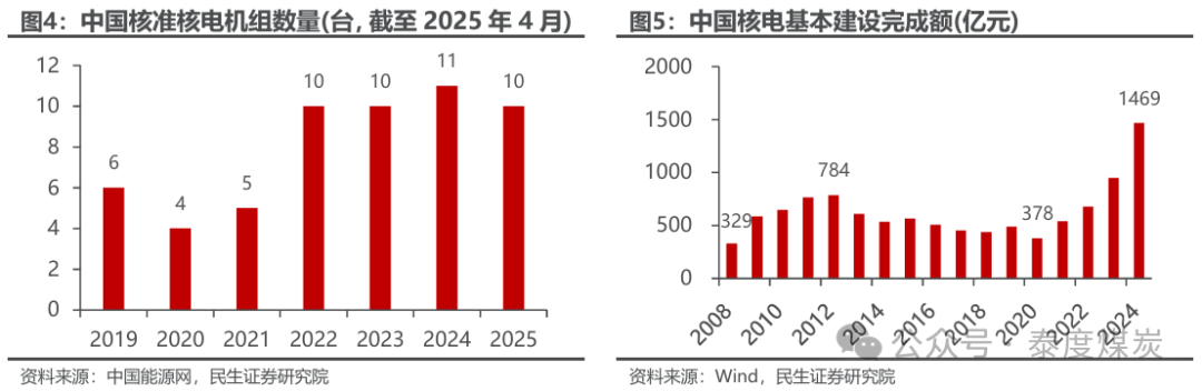 中国核电发展加速,贡献中长期核心增量。截至2025年3月,我国在运核电机组达到58台,装机容量6082万千瓦,2024年以不足全国2%的装机占比贡献4.7%的发电量。2022-2025年,我国每年核准核电机组10台及以上,7年累计核准新核电项目28个,合计56台机组。据WNA统计,截至2025年3月中国在建和规划(15年内投入运行)核电站合计71个、装机容量80.25GW,拟建核电站152个、装机容量180.75GW,中国核准及在建、规划核电规模保持全球断层式领先。据中国核能行业协会,到2035年我国核电发电量占比有望达到10%,到2060年为实现碳中和目标,占比有望达到18%。截至2024年,中国在运和核准在建核电机组装机规模升至世界第一,中长期将持续贡献全球核电主要增量。