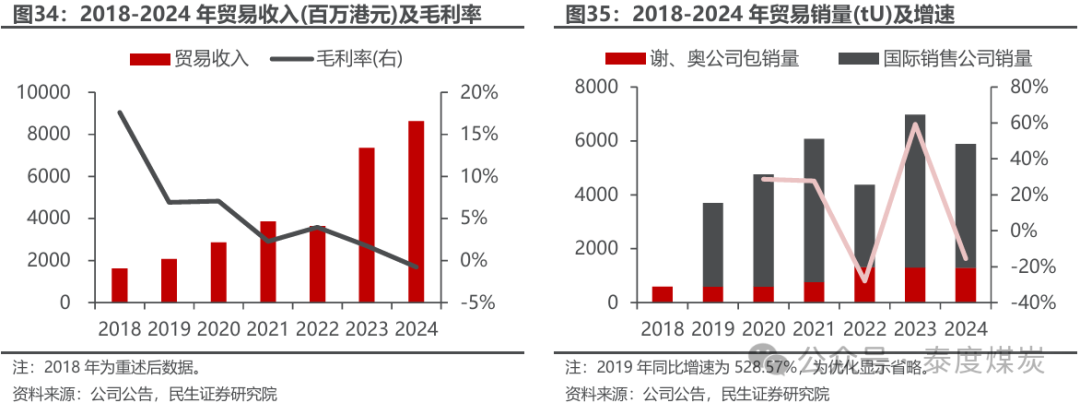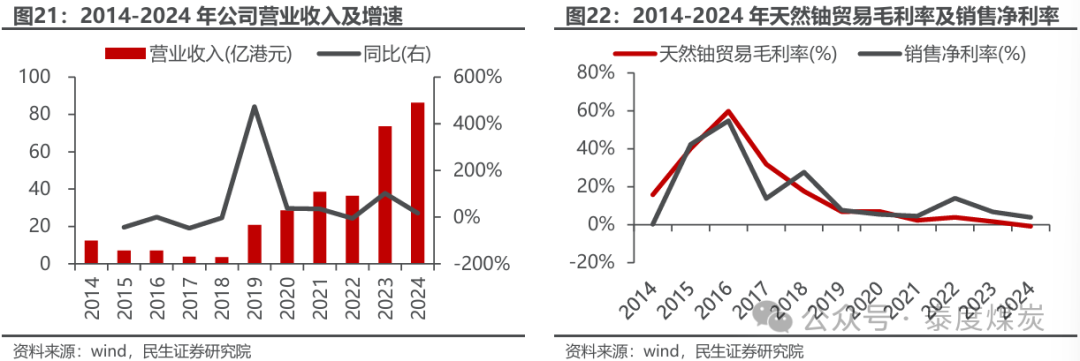 贸易收入近年持续增长,毛利率因价差收窄呈下滑趋势。公司营业收入基本全部由贸易业务贡献,来自自有矿山产品包销和国际贸易业务。2015年,公司退出药品食品行业、正式收购谢公司49%股权并取得相应包销权,当年营收下滑但得益于包销业务的成本优势,贸易毛利不降反升。但由于2017年起公司与控股股东中国铀业发展公司基于利益共享、风险共担原则实行新的定价机制,即在参考市场价格的基础上封顶保底,贸易毛利开始出现下滑。2019年,公司收购国际销售公司大力开展国际市场,当年营收实现4.7倍的大幅增长,而后2023年因铀价进入加速上涨阶段营收增幅达到101.80%,但因铀价波动贸易价差收窄,贸易业务毛利率自2017年起整体呈下滑趋势。2024年,公司实现营业收入86.24亿港元,同比增长17.13%,但因包销与国际贸易价差进一步收窄,贸易业务毛利率-0.77%。