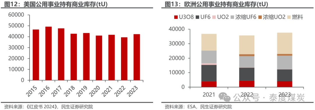 Ø 商业库存:持有方惜售,可流动库存减少。商业库存主要包括铀矿企业周转库存、核电站业主商业储备和国家战略储备,其中核电业主是全球最大持有方,约占商业铀库存总量的85%。福岛核事故后,需求下降使得市场参与者积累大量商业库存,近年伴随核电复苏、一次供给受矿商生产意愿和疫情影响波动较大,过剩库存被逐步吸收,2017年以来全球库存稳步下降,虽然过去两年有所增加,但我们预计未来商业库存所形成的二级供给将逐渐减少,原因主要系:1)近两年库存增量主要为确保燃料供应安全的战略库存,而非流动库存。据EIA数据,2023年美国公用事业库存同比增长7.4%,但较2016年高点相比下降14.0%;据ESA数据,2023年欧洲公共事业库存同比增长5.4%,相当于约三年的燃料供应量。而东亚地区尤其是中国的铀需求正在快速增长,据IAEA数据,截至2023年1月,印度累计铀库存约为1.7万吨,二次供应的枯竭导致许多国家继续持有现有库存。2)金融机构看好铀价前景倾向持有而非抛售。如前所述,SPUT基金在不可赎回机制持续的条件下,二次供给将转化为二次需求,而其他可抛售基金因看好铀价前景出售活动将大幅降低。3)政府库存转化近年逐步减少。此前,美俄政府持有的冷战时期军用高浓铀转化为商业库存为市场带来重要的二次供给,但因在用于反应堆前需经过处理,近年逐步减少。