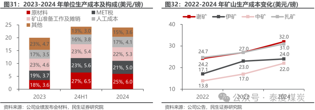 原材料及MET税抬高生产成本,奥公司受硫酸价格成本波动较大。矿山单位生产成本由原材料、MET税(铀矿开采税)、矿山准备工作及摊销、人工成本和其他成本构成,2024年各单项成本分别占比25%/21%/22%/17%/15%,综合单位生产成本达到24美元/磅,同比上涨20%。铀矿开发新区块涉及矿体酸化,谢公司区块均已成熟、基本无酸化需求,奥公司中矿因其新矿特性成本较低但受硫酸价格影响,扎矿处于前期准备阶段亦有酸化需求且成本波动较大,结合各矿山特点分析成本上涨的主要原因,一是原材料和矿山准备工作及摊销受奥公司硫酸用量及价格大幅提升影响,分别同比增69%和14%;二是MET税跟随销售收入同步上涨,同比增长36%;三是人工成本受普调人工工资影响同比增长18%。