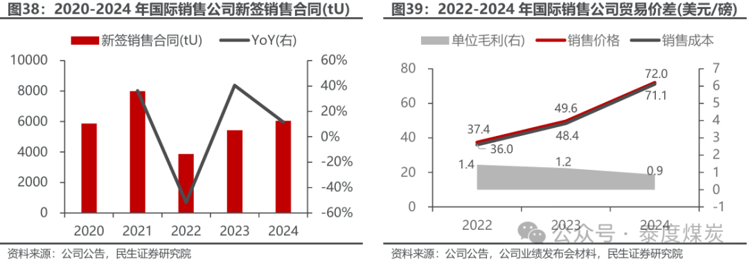 国际贸易攻守兼备,贸易量及新签销售合同增长。公司国际贸易业务大部分采销两端同时锁定,赚取稳定价差,同时保留部分未锁定业务以通过铀价上涨获利,目前客户结构包括亚洲、欧洲和北美。2023-2024年,国际销售公司贸易量分别实现5670/4593tU,同比+85.6%/-19.0%;2023-2024年,年度累计新签销售合同5423/6049tU,同比+40.5%/+11.5%,为未来利润奠定基础。