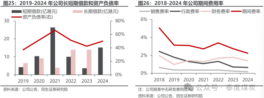 资产结构稳健,期间费用管控良好。2019-2021年,公司因收购国际销售公司、奥公司及展业需要,向控股股东提取股东贷款,导致资产负债率有所上升;2022-2023年,公司运行稳定并偿还部分银行借款,资产负债率降至42.52%;截至2024年末,公司资产负债率为49.99%,同比上升主因银行借款随天然铀采购量同步增加,资本结构整体较为稳健。2018-2024年公司期间费率由5.1%降至2.2%,其中行政费率和销售费率降幅明显,分别由2.4%、0.6%降至0.7%、0.2%。