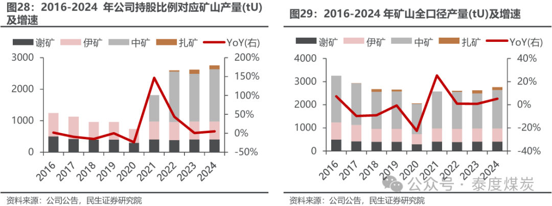 Ø 销售上限预留额外缓冲,充分考虑潜在资源量提升。新协议中预计谢、奥公司在产铀矿2026-2028年包销量为1438/1617/1598tU,较2024年实际包销量1294 tU明显提升。此外,公司考虑潜在铀资源投资机会,在年度销售上限中预留600tU/年的额外缓冲,充分体现公司未来成长属性。