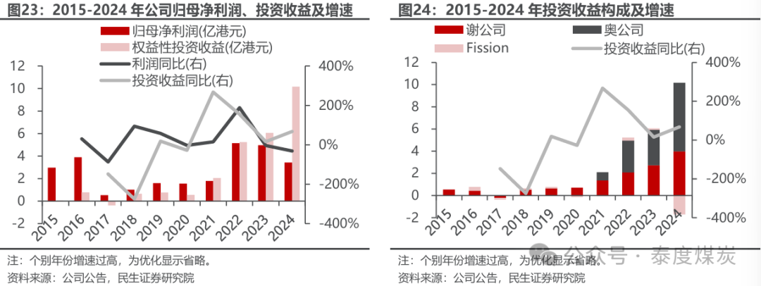 投资收益强势上涨,2024年所得税费用和终止经营损失影响利润释放。公司归母净利润主要由权益性投资收益贡献,2023/2024年占归母净利润比重达到122%/297%。公司分别于2015、2016、2021年完成对谢公司49%股权、Fission公司19.99%股权、奥公司49%股权的收购,自2015年谢公司开始贡献投资收益以来,除2017年因哈原工减产和铀价下跌录得亏损,公司投资收益整体呈上升趋势。2022年,铀价上行叠加完成奥公司收购,投资收益高增带动利润同比近2倍增长。2023年以来,公司包销业务因销售给控股股东定价较低导致的贸易亏损伴随铀价上涨而进一步扩大,但同时投资收益的加速增长足以弥补贸易亏损并进一步增厚利润。2024年,铀价同比大幅上涨,虽下半年有所回落但仍保持高位,公司投资收益同比增长67.71%至10.16亿港元,但因哈萨克斯坦税收口径逐渐收紧,公司将奥公司分红预提税率由5%上调至15%,并按差额补提补缴以前年度税费,导致2024所得税费用同比增加2.25亿港元(+361%),此外Fission公司被换股收购引起亏损约1.7亿港元,影响公司业绩释放。若剔除上述非经因素,2024年公司净利润约6.4亿港元,同比增长29%。
