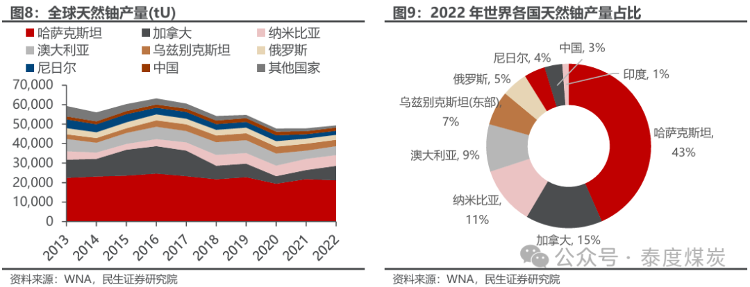 全球天然铀产量近年有所恢复,集中度较高。受福岛核事故影响,2019年以前天然铀市场长期处于低迷状态,全球产量整体呈现收缩趋势,2019年短暂恢复后,全球疫情使矿山开采活动受限从而2020年又出现明显下降,2021年起铀价上涨驱动矿山增产,产量逐年递增。2022年全球天然铀产量4.94万吨,折合U3O8约为5.82万吨,CR6达到90%,分别为哈萨克斯坦43%、加拿大15%、纳米比亚11%、澳大利亚9%、乌兹别克斯坦7%、俄罗斯5%。值得注意的是,哈萨克斯坦并非资源第一大国,但产量居首位,低成本铀资源处于加速消耗阶段。