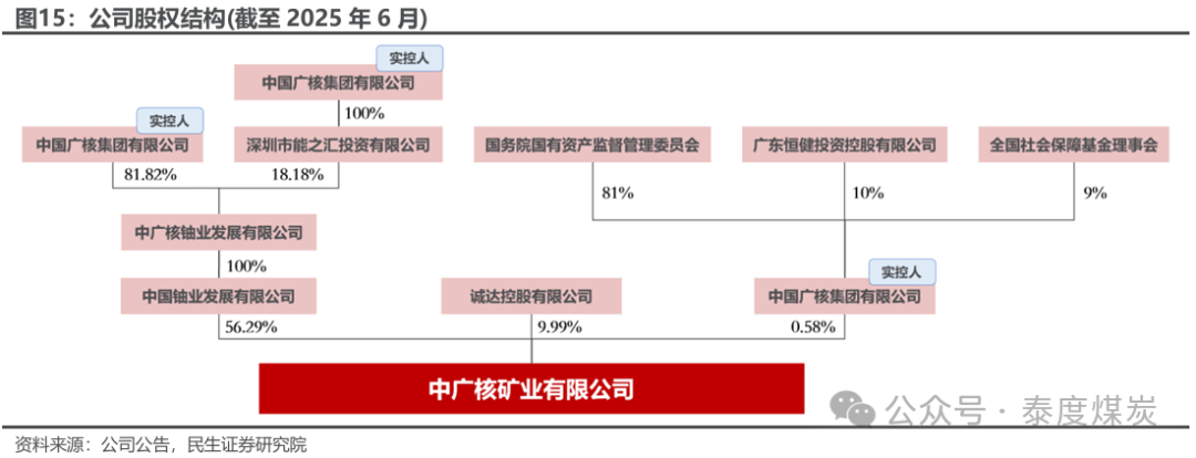 公司控股股东中国铀业发展有限公司,实际控制人中广核集团。截至2025年6月,公司控股股东为中国铀业发展有限公司,持股比例56.29%;实际控制人为中广核集团,直接持股0.58%,通过中广核铀业发展公司间接持股56.29%,合计持股比例56.87%;此外诚达控股有限公司持有公司9.99%股份。