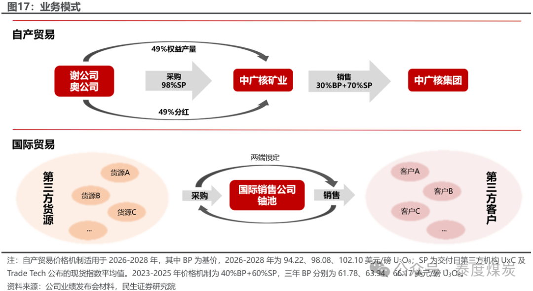 铀矿投资收益贡献主要利润,自产贸易和国际贸易并行。公司主要利润来自哈萨克4座铀矿的投资收益。自产贸易方面,公司拥有谢公司和奥公司天然铀49%产量的包销权,以现货价格(SP)自谢/奥公司采购,再以“30%基准价格(BP)+70%现货价格(SP)(2026-2028年;2023-2025年为40%BP+60%SP)”向中广核集团销售;国际贸易方面,公司从第三方货源采购并销售给第三方客户,采销两端同时锁定,赚取稳定价差,目前客户结构包括亚洲、欧洲和北美。