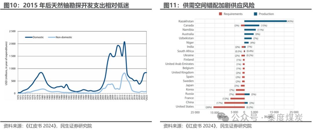 勘探开发支出低迷,供需空间错配加剧供应风险。2015-2020年铀价表现低迷,从而铀矿勘探开发节奏放缓,相关支出大幅下滑,2020年后伴随铀价上涨,矿山勘探开发支出有所增长,但远低于2014年水平、处于相对低位。同时,天然铀资源量、产量和核电装机容量存在空间错配现象,截至2023年,在所有拥有核能发电能力的国家中,只有加拿大生产的铀足以满足其国内需求,其他拥有核电的国家都依赖进口铀或二次来源,使得铀国际贸易成为供给市场关键,当前国际形势不确定性和地缘冲突局势进一步加剧了天然铀供应风险。