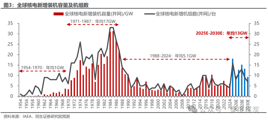 SMR技术重塑核电经济性与应用场景。SMR(小型模块化核电机组)是指功率和物理尺寸都比传统的千兆瓦级发电厂小的核反应堆(30万千瓦以下),其优势主要体现在以下三个方面:1)模块化降本:SMR能够通过标准模块化的形式在工厂制造,有利于缩短建设周期和减少资本开支,成本竞争力强。同时SMR支持分期建设,单模块功率 低于300兆瓦,可随数据中心或工业园区用电增长逐步扩容,避免一次性重资产投入。2)应用场景多元:模块化小堆具备部署灵活、靠近负荷中心特性,单台SMR功率与大型数据中心集群耗电量相当,为AI数据中心稳定低碳电源首选,同时SMR也可以布局在偏远地区与离网场景,在非电领域可将热能多元化利用,应用于工业制氢、海水淡化、城市供热等。3)安全性升级:SMR采用被动安全设计,如“玲龙一号”采用“固有安全+非能动冷却”,事故下无需外部干预即可实现堆芯冷却,应急响应范围压缩至300米以内,仅为传统大堆的1/30。据NEA数据,在运核电机组延寿运行、建设大型第三代核电机组、建设SMR三种方式需同步发展方可实现3倍核电装机容量目标,乐观情境下2050年SMR装机达375GW,占净零目标下全球核电装机30%以上。