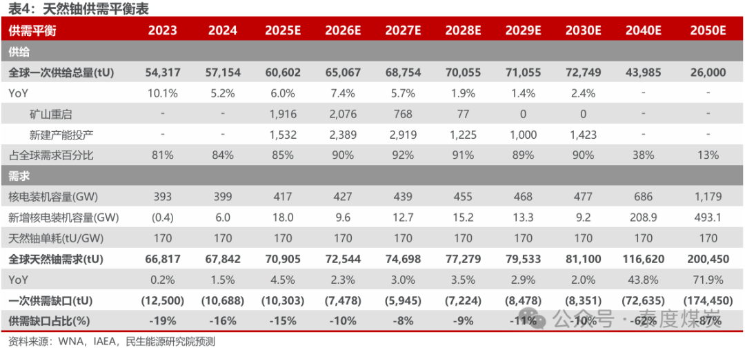 综合前文分析,伴随二级供给的持续消耗,天然铀定价将逐渐回归一次供需判断,我们梳理天然铀一次供需得出如下判断: