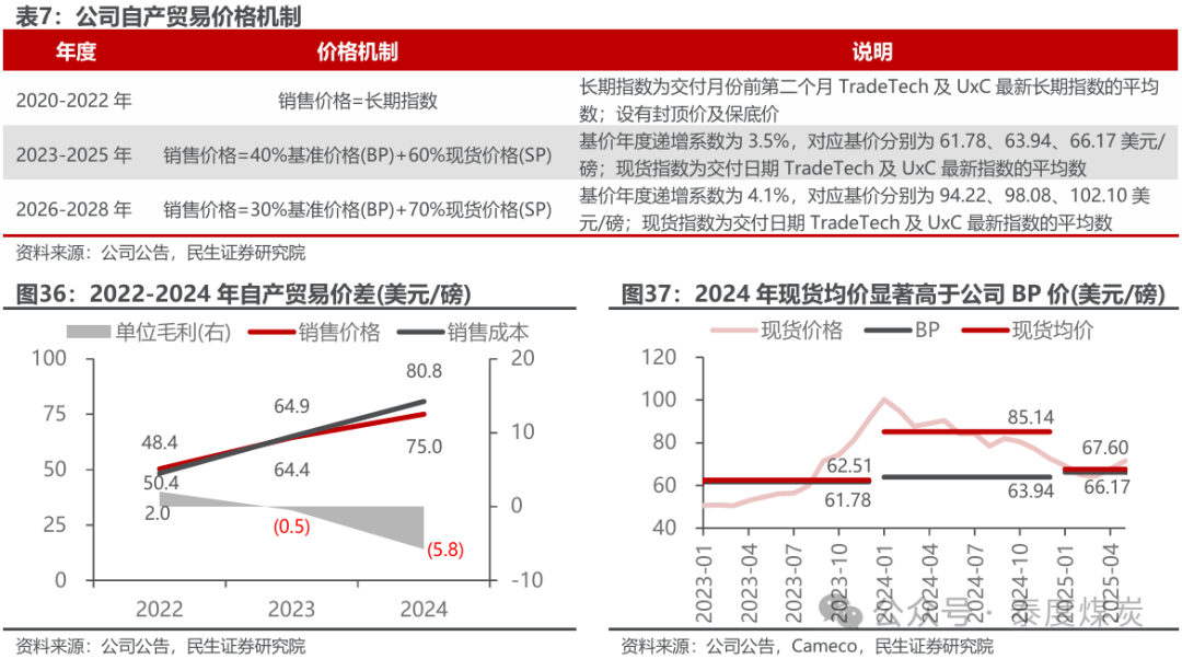 自产贸易新定价机制基准价格和递增系数、现货价占比、销售上限均提升。公司拥有谢、奥公司49%产量的包销权,以“98%现货价格(SP)”自谢、奥公司采购,再向控股股东中广核铀业发展公司销售,价格机制每3年制定一次。2023-2025年价格机制中,厘定的基准价格分别为61.78、63.94、66.17美元/磅U3O8,但伴随铀价快速上涨,2024年实际现货均价已大幅高于基准价格BP,从而导致公司自产贸易售价、成本倒挂出现亏损。公司2025年6月公告与中国铀业发展公司签订2026-2028年销售框架协议,新协议有以下亮点: